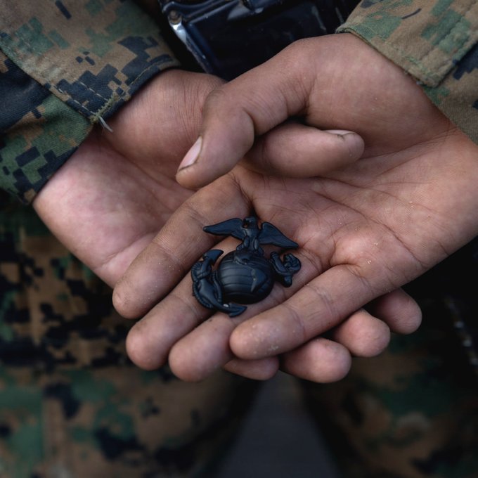 When a recruit first earns the title, they are handed an Eagle, Globe, and Anchor to signify that they are now Marines. This revered emblem is a representation that Marines can be called to fight in any clime and place.